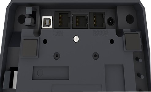Printo Line w opcji może być wyposażona w interfejs Ethernet lub Bluetooth. Możesz również standardowo korzystać z podłączenia drukarki poprzez port USB i RS232. Wszystkie złącza gniazd kabli przyłączeniowych (komputer, zasilacz, szuflada itp.) są umieszczone od spodu drukarki.