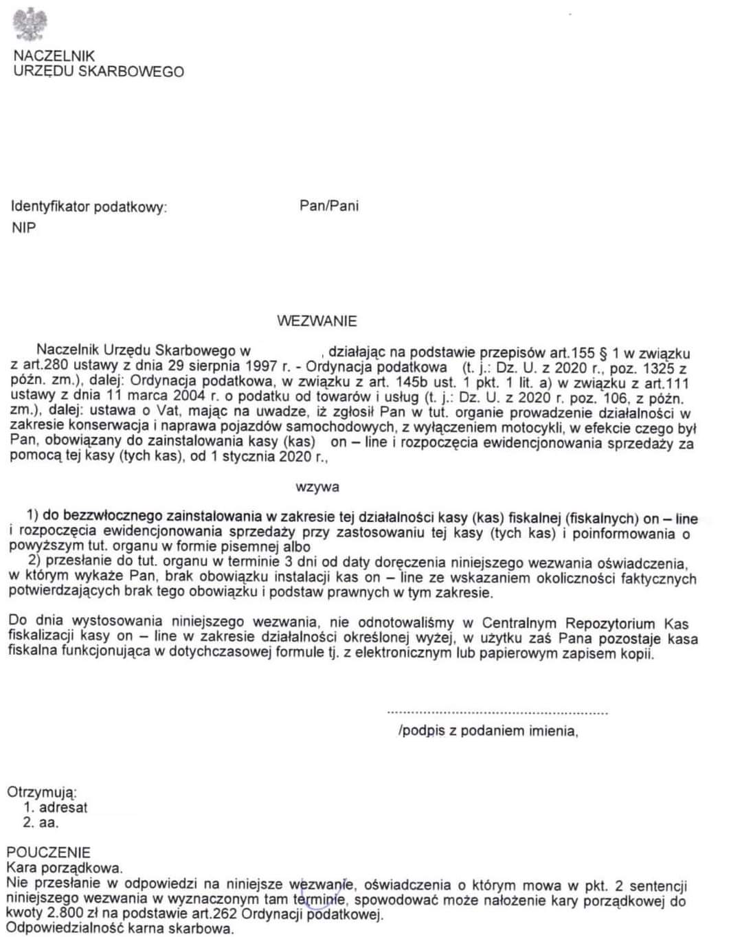 Od granicznej daty 01.01.2021 r. podmioty te nie mogą używać starych kas oraz drukarek fiskalnych. Może również okazać się, że rejestrowanie sprzedaży na starych urządzeniach od nowego roku będzie uznawane jako brak ewidencjonowania sprzedaży zagrożony sankcjami karno-skarbowymi. Urzędy Skarbowe stale sprawdzają podatników, którzy powini mieć zainstalowane urządzenie online, czy wywiązali się z nałożonych obowiązków. Jeżeli "przyłapią" kogoś, kto kasy nie zainstaluje a powinien, rozsyłają odpowiednie pisma. Wzór takiego pisma prezentujemy TUTAJ