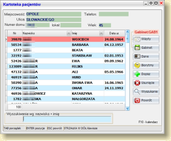 - wspólna dla wszystkich gabinetów kartoteka pacjentów z opcją szybkiego wyszukiwania oraz filtrowania listy,