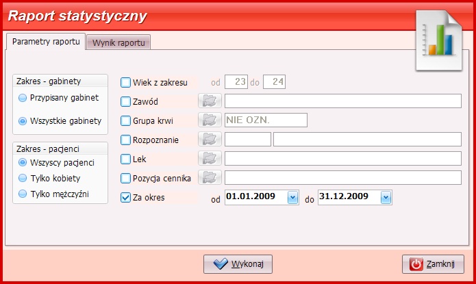 - raporty: wystawionych recept, kart informacyjnych, statystyka,