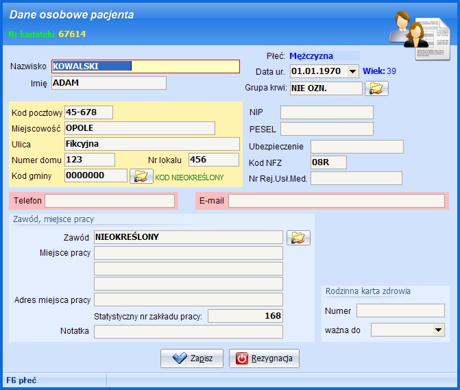 Edycja danych osobowych pacjenta. Zakres danych tj. czy ma być edytowane pole Zawód, Miejsce pracy i inne - ustawiane są w parametrach programu.