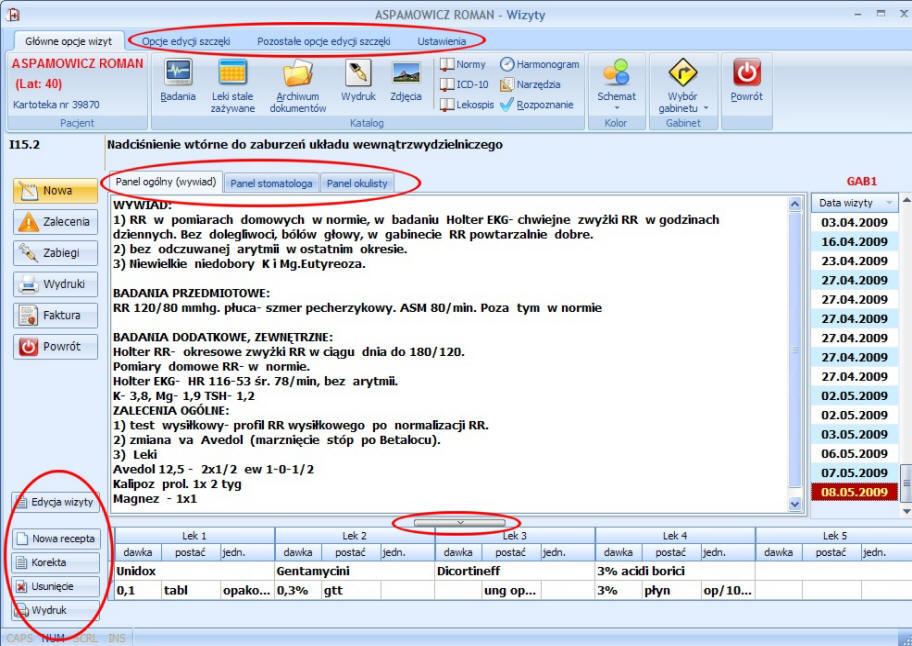 - podgląd wizyt poprzednich, wystawianie recept na podstawie wcześniej wystawionych lub leków stałych,