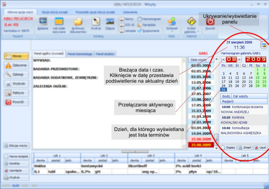 - podręczny harmonogram wizyt (znacznie bardziej rozbudowana wersja harmonogramu znajduje się w programie Rejestracja, który współpracuje z programem SOGaL),