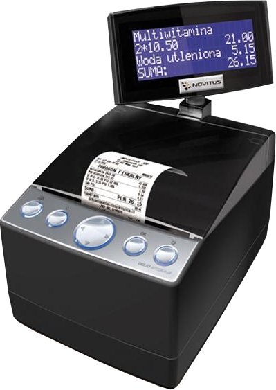 Wysoka wydajność, szybkość działania i cicha praca zapewniają wysoki komfort obsługi klienta. Dzięki optymalizacji wydruków i zastosowaniu jednego nowoczesnego, termicznego mechanizmu drukującego i rejestracji kopii wydruków na specjalnej karcie NovitusSD, drukarka DELIO APTEKA E jest urządzeniem tanim w eksploatacji. Posiada wiele funkcji usprawniających działanie placówki handlowej. Duży, obrotowy (na życzenie podwyższony), czytelny, czteroliniowy wyświetlacz w kolorze niebieskim dokładnie wyświetla informacje o sprzedawanych towarach, lekach, cenach, kwotach, refundacjach, sumach do zapłaty, opisie recepty, oraz innych operacjach wykonywanych na drukarce fiskalnej. Można na niej drukować potwierdzenie zamówienie leku robionego, recepturę leku itp.