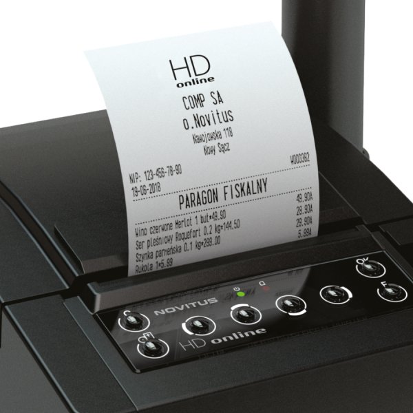 Drukarka Novitus HD Online została wyposażona w niezawodny, trwały i szybki mechanizm drukujący japońskiej firmy Citizen. Technologia tego mechanizmu pozwala na druk nie tylko paragonów, ale i również faktur VAT. Wydruki mogą być realizowane na papierze o szerokości 57 lub 80 mm za pomocą kilku rodzajów czcionek. Wydruk paragonu zawierającego 100 pozycji odbywa się w czasie 5,5 sekundy, a maksymalna ilość towarów na jednym paragonie to 255. Paragon jest odcinany za pomocą profesjonalnego obcinacza papieru montowanego w drukarce w standardzie.