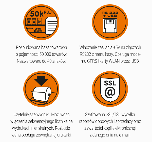 | LICZBA KLAWISZY SZYBKIEJ OBSŁUGI | 28 (14 w dwóch poziomach) + 10 w trybie "szybka sprzedaż" |