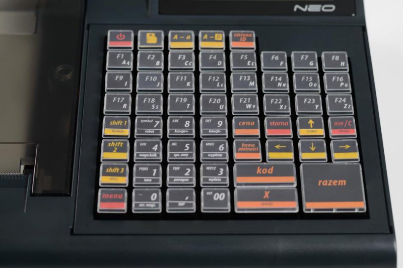 Kasa NEO XL wyposażona jest w wytrzymałą, mechaniczną klawiaturę switchową. Klawiatura alfabetyczna ułatwi i usprawni programowanie bazy towarowej, wprowadzanie komunikatów przypomnień, dodatkowych pól opisowych itp. Klawisze funkcyjne, np. tara i zerowanie wagi zintegrowanej oraz 104 klawisze skrótu (4 poziomy po 26 klawiszy) zapewniają bezpośredni dostęp do najczęstszych operacji sprzedażowych, co podnosi komfort użytkowania kasy i przyspiesza obsługę klienta.